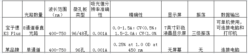 另外,我們用數(shù)據(jù)說話,對(duì)比某著名品牌同類型酶標(biāo)儀,各水平參數(shù)如下: