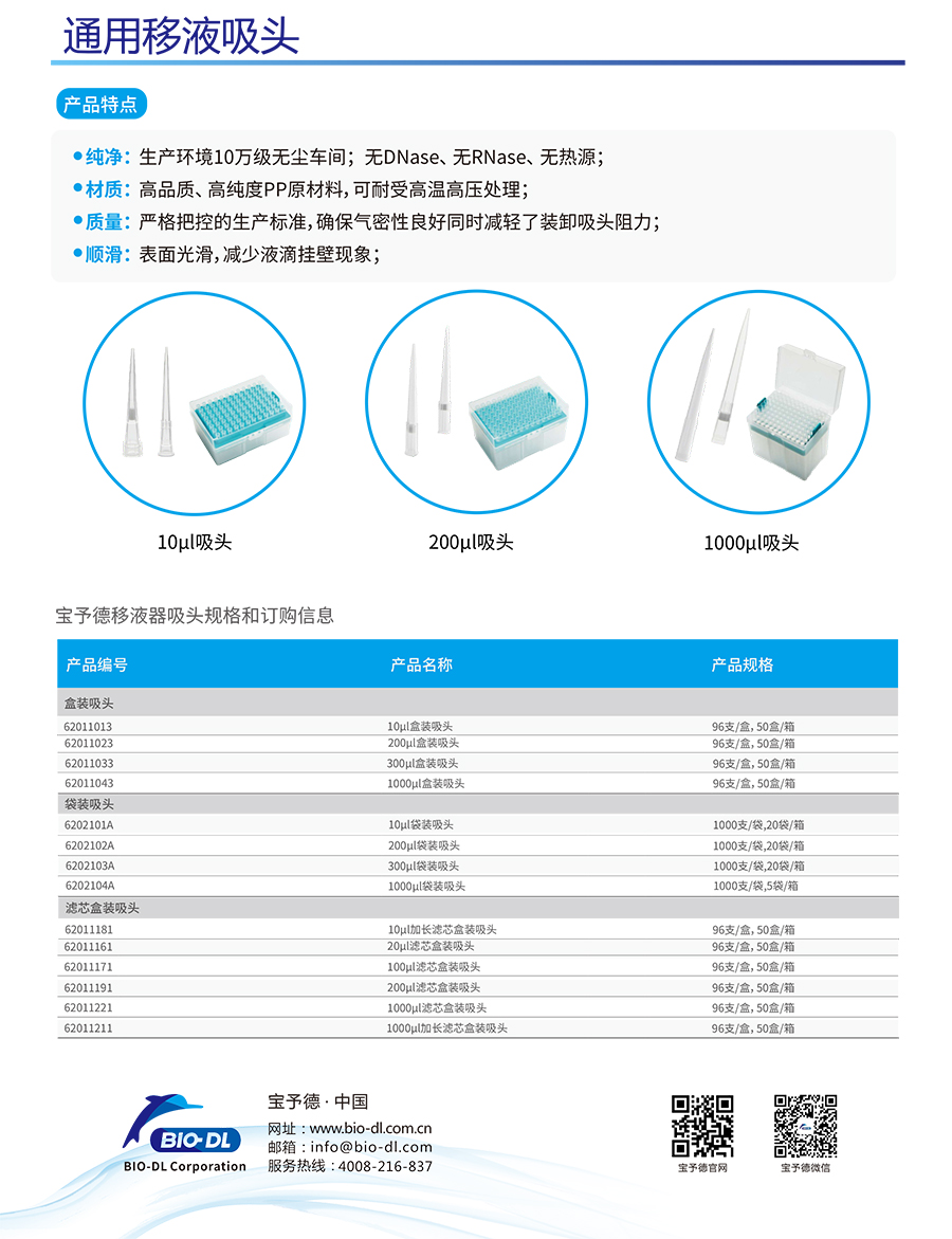 BIO-DL為您提供精確的移液器吸頭,與大多數(shù)其他品牌移液器一起使用,都具有更好的可重復性和準確度。
